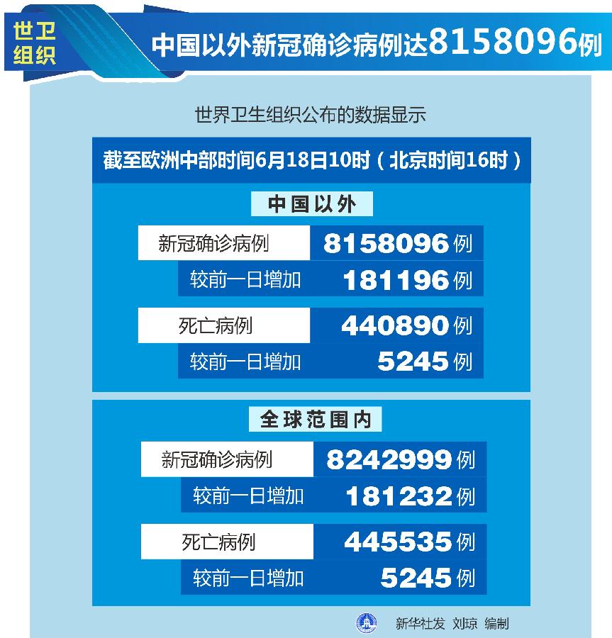 新華社日內瓦6月18日電(記者劉曲)世界衛生組織18日公布的最新數據顯示,中國以外新冠確診病例達到8158096例。