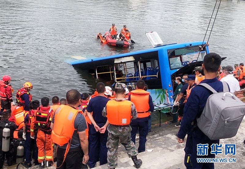 7月7日,墜湖公交車被打撈出水。新華社發(龍瑞 攝)