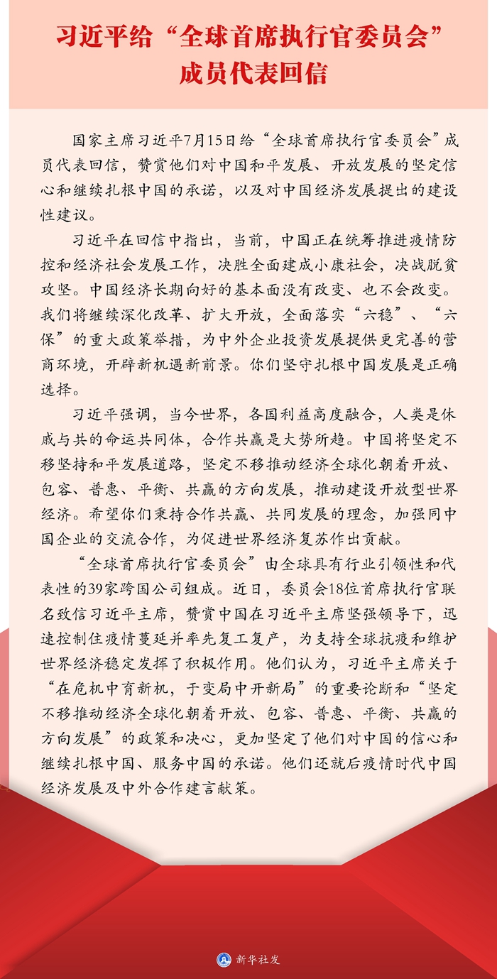 “全球首席執行官委員會”由全球具有行業引領性和代表性的39家跨國公司組成。近日,委員會18位首席執行官聯名致信習近平主席,贊賞中國在習近平主席堅強領導下,迅速控制住疫情蔓延并率先復工復產,為支持全球抗疫和維護世界經濟穩定發揮了積極作用。他們認為,習近平主席關于“在危機中育新機,于變局中開新局”的重要論斷和“堅定不移推動經濟全球化朝著開放、包容、普惠、平衡、共贏的方向發展”的政策和決心,更加堅定了他們對中國的信心和繼續扎根中國、服務中國的承諾。他們還就后疫情時代中國經濟發展及中外合作建言獻策。