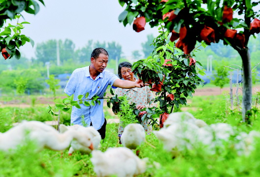 6月11日,李?。ㄗ螅┰谕┌乜h埠江鎮付樓村黃金梨種植基地查看黃金梨套袋情況。本報記者郝源攝