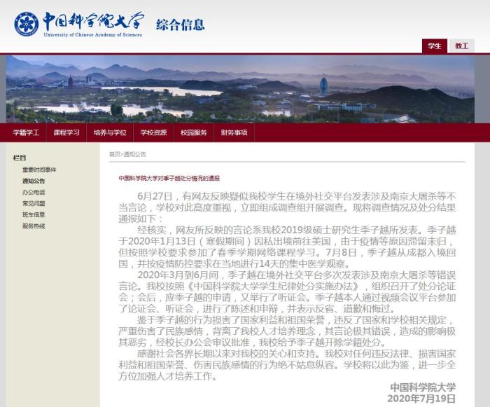 2020年3月到6月間,季子越在境外社交平臺多次發表涉及南京大屠殺等錯誤言論。中國科學院大學按照《中國科學院大學學生紀律處分實施辦法》,組織召開了處分論證會;會后,應季子越的申請,又舉行了聽證會。季子越本人通過視頻會議平臺參加了論證會、聽證會,進行了陳述和申辯,并表示反省、道歉和悔過。