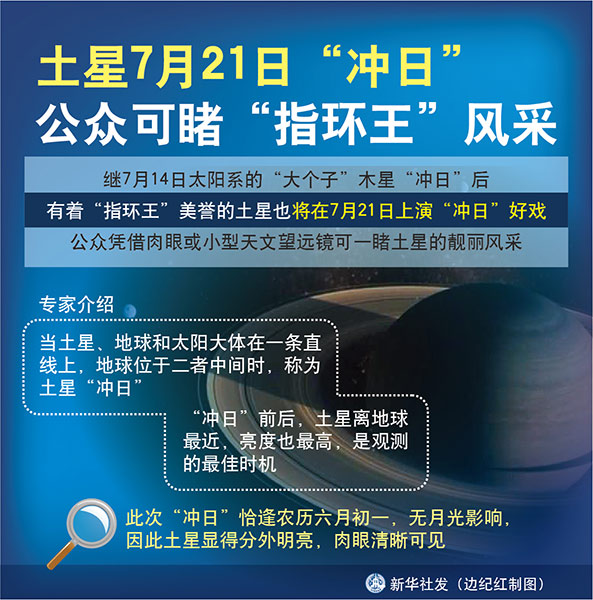 新華社天津7月19日電(記者周潤?。├^7月14日太陽系的“大個子”木星“沖日”后,有著“指環王”美譽的土星也將在7月21日上演“沖日”好戲,公眾憑借肉眼或小型天文望遠鏡可一睹土星的靚麗風采。
