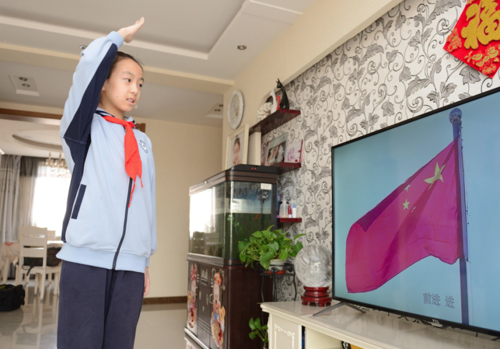 2月29日,呼和浩特,一名小學生在家中參加線上升旗儀式