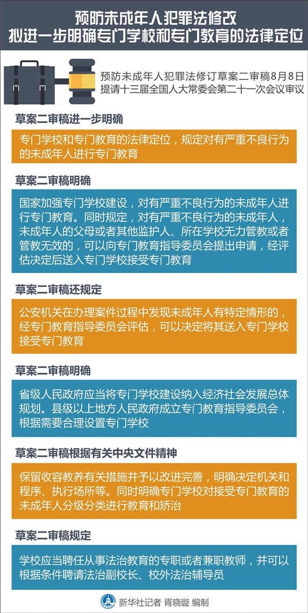 新華社北京8月8日電(記者熊豐)預防未成年人犯罪法修訂草案二審稿8日提請十三屆全國人大常委會第二十一次會議審議。草案二審稿進一步明確專門學校和專門教育的法律定位,規定對有嚴重不良行為的未成年人進行專門教育。
