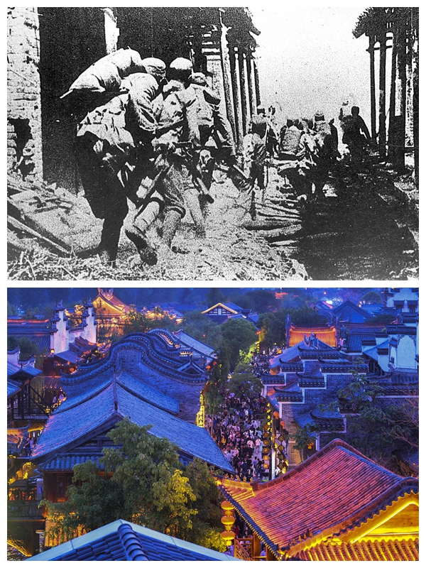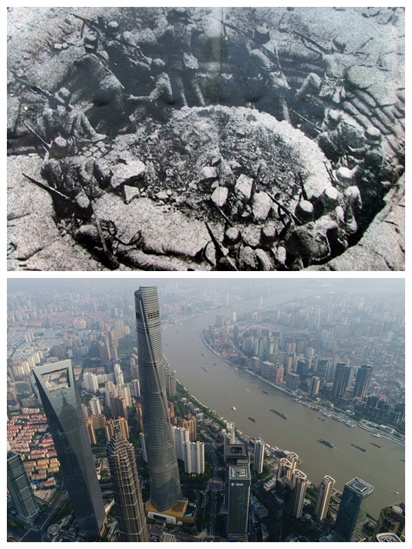 上圖為1937年8月13日至11月12日,中日軍隊進行淞滬會戰,這次會戰粉碎了日本軍國主義者速戰速決的迷夢。這是中國軍隊88師在上海閘北的環形工事里同日軍巷戰。