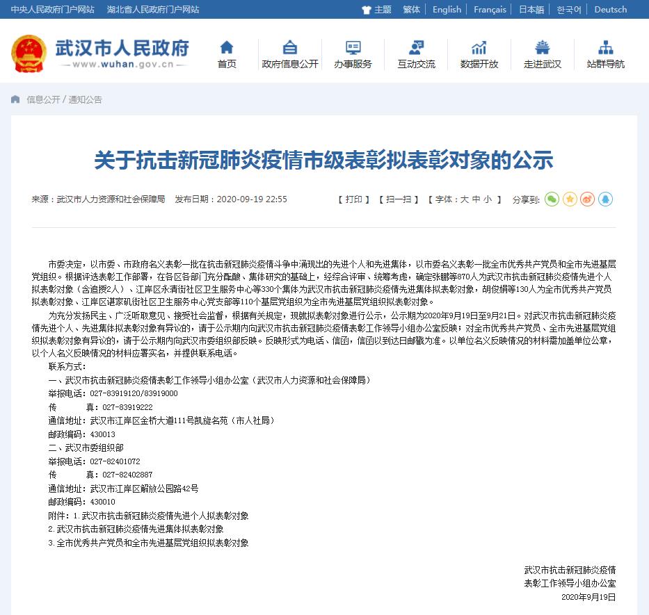 9月19日,武漢市抗擊新冠肺炎疫情表彰工作領導小組辦公室發布關于抗擊新冠肺炎疫情市級表彰擬表彰對象的公示:市委決定,以市委、市政府名義表彰一批在抗擊新冠肺炎疫情斗爭中涌現出的先進個人和先進集體,以市委名義表彰一批全市優秀共產黨員和全市先進基層黨組織。根據評選表彰工作部署,在各區各部門充分醞釀、集體研究的基礎上,經綜合評審、統籌考慮,確定張鵬等870人為武漢市抗擊新冠肺炎疫情先進個人擬表彰對象(含追授2人)、江岸區永清街社區衛生服務中心等330個集體為武漢市抗擊新冠肺炎疫情先進集體擬表彰對象,胡俊娟等130人為全市優秀共產黨員擬表彰對象、江岸區諶家磯街社區衛生服務中心黨支部等110個基層黨組織為全市先進基層黨組織擬表彰對象。