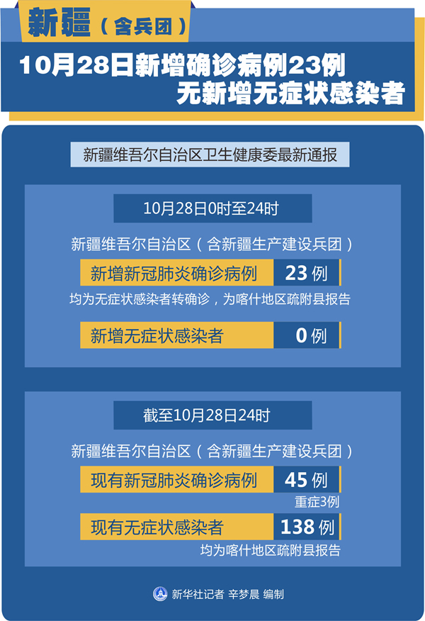新華社烏魯木齊10月29日電(記者潘瑩、馬鍇)新疆維吾爾自治區衛生健康委最新通報,10月28日0時至24時,新疆維吾爾自治區(含新疆生產建設兵團)報告新增新冠肺炎確診病例23例,均為無癥狀感染者轉確診,為喀什地區疏附縣報告;無新增無癥狀感染者。