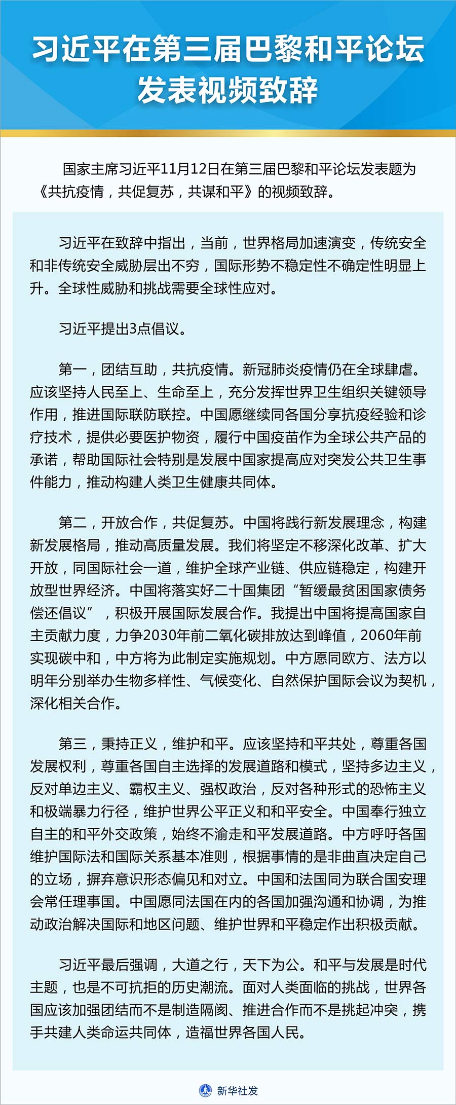 新華社北京11月12日電 國家主席習近平12日在第三屆巴黎和平論壇發表題為《共抗疫情,共促復蘇,共謀和平》的視頻致辭。