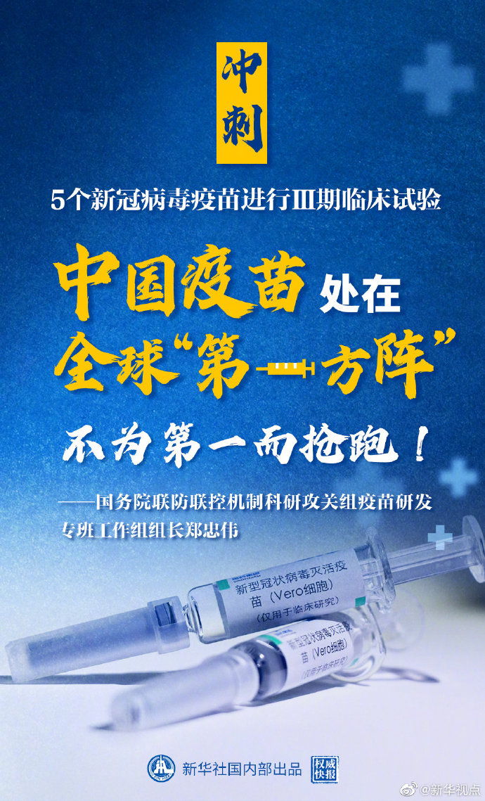 “我國目前已有5個新冠病毒疫苗進行Ⅲ期臨床試驗,數量位于全球前列?!眹鴦赵郝摲缆摽貦C制科研攻關組疫苗研發專班工作組組長鄭忠偉接受新華社記者專訪時說,“疫苗研發已經進入沖刺階段,我們處于全球第一方陣,但不為第一而搶跑?!薄霸u價一個疫苗需要多項綜合指標,其中安全性、有效性、可及性、可負擔性是最重要的?!保ㄓ浾撸宏惙?、董瑞豐 海報設計:張惠慧)