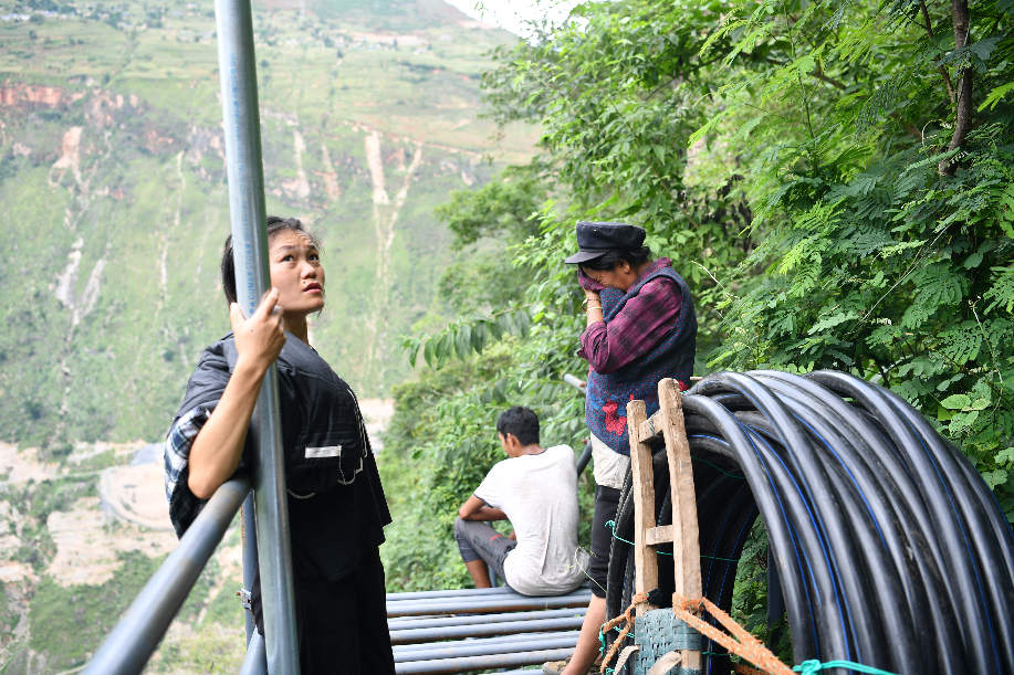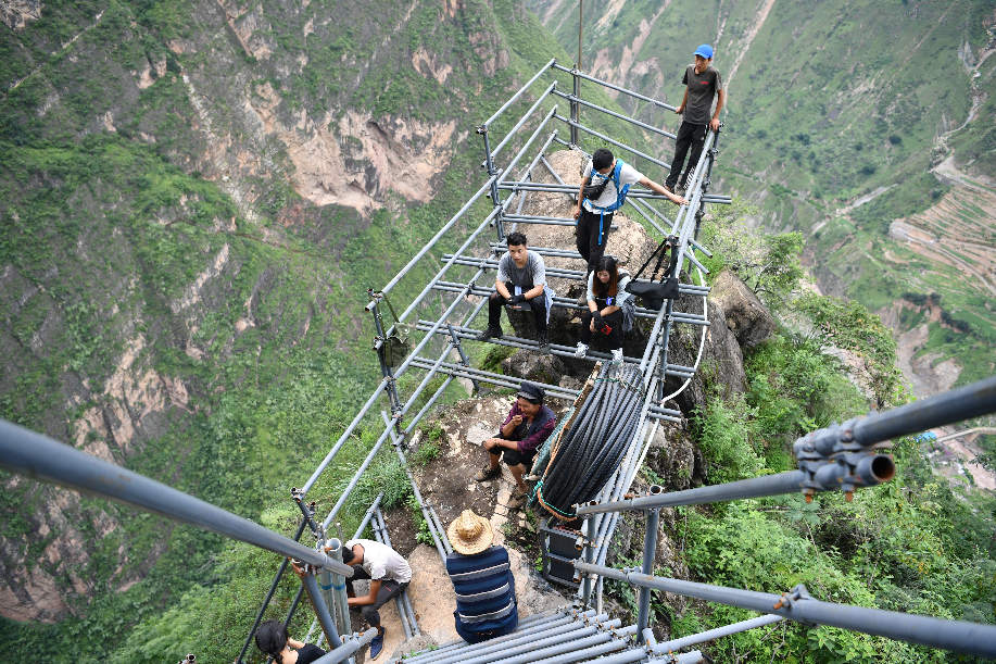 ????2017年9月初,四川涼山“懸崖村”村民背貨物通過天梯上山,中途休息。四川省涼山州昭覺縣支爾莫鄉阿土列爾村,坐落于海拔約1600米的山坳中,從山底到山頂村莊海拔高差近1000米,村民往返村子都需要借助懸崖峭壁間的天梯,從而被稱為“懸崖村”。為緩解村民出行險的問題,當地投入120噸鋼材、共6000根鋼管修筑了2556級“鋼管天梯”,工程于2017年6月底徹底完工,如今,“鋼管天梯”已經取代了之前更危險的藤梯,成為村民通往外界唯一的道路。 張浪攝