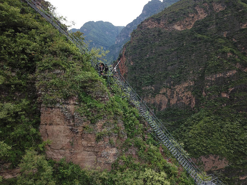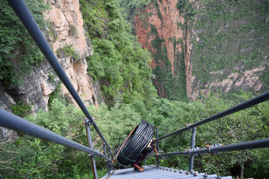 ????2017年9月初,四川涼山“懸崖村”村民背貨物通過天梯上山。四川省涼山州昭覺縣支爾莫鄉阿土列爾村,坐落于海拔約1600米的山坳中,從山底到山頂村莊海拔高差近1000米,村民往返村子都需要借助懸崖峭壁間的天梯,從而被稱為“懸崖村”。為緩解村民出行險的問題,當地投入120噸鋼材、共6000根鋼管修筑了2556級“鋼管天梯”,工程于2017年6月底徹底完工,如今,“鋼管天梯”已經取代了之前更危險的藤梯,成為村民通往外界唯一的道路。 張浪 攝