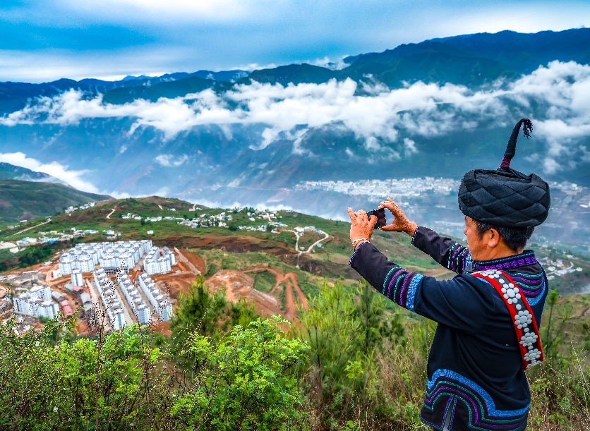????四川涼山彝族自治州金陽縣馬依足鎮“千戶彝寨”東山易地移民社區,占地300余畝,2020年8月完工,已完成安置易地搬遷戶1600多戶。圖為易地搬遷居民在看望即將搬入的新居時,用手機記錄下美麗的新家園。 楊黎明 攝