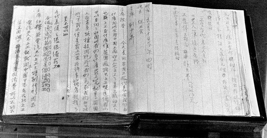 圖為五卅運動期間劉少奇同志召集上海英國工廠工人代表開會的一份會議記錄,會議一致通過對英國工廠繼續罷工 新華社圖片