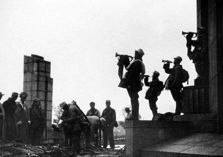 遼沈戰役我司號員吹響勝利的號角。 新華社圖片