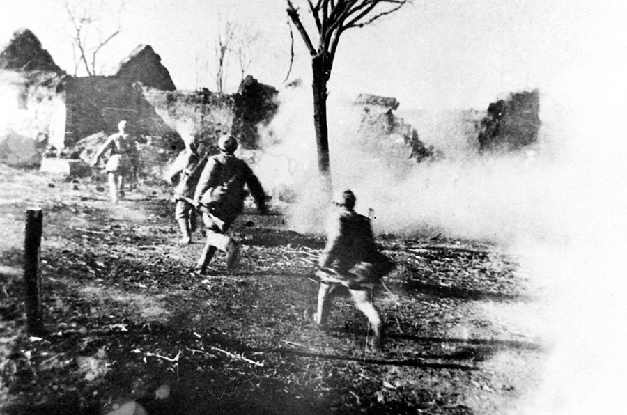 在淮海戰役中,人民解放軍突破濃煙密火,撲向國民黨軍的指揮所魯樓。 新華社圖片