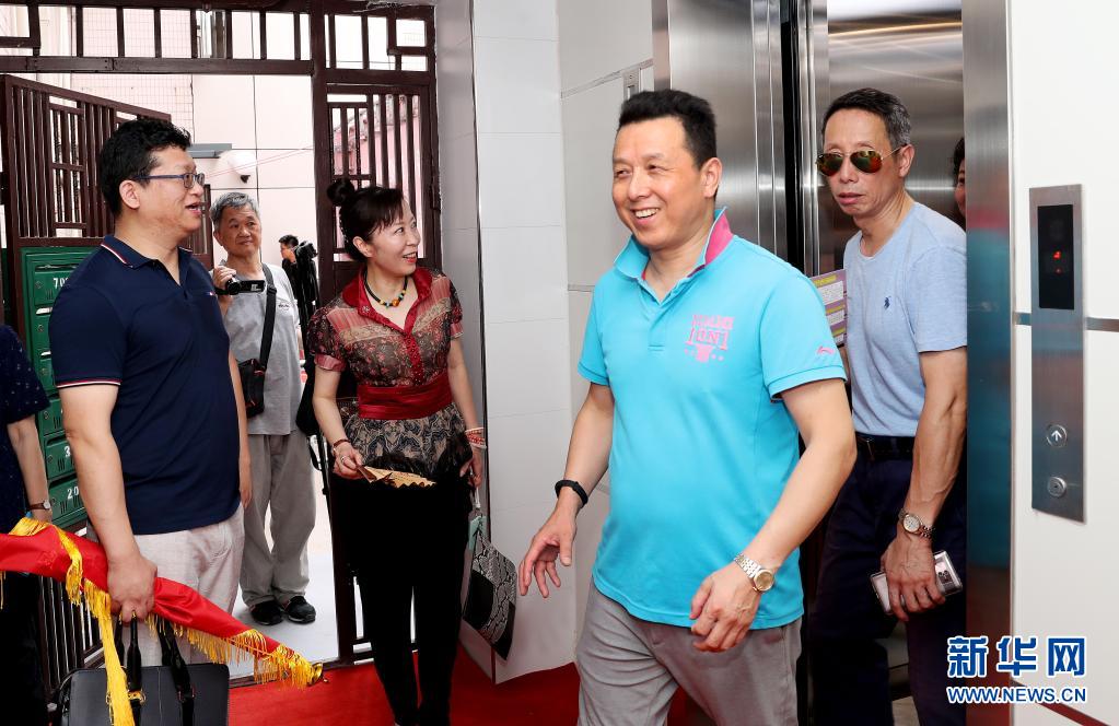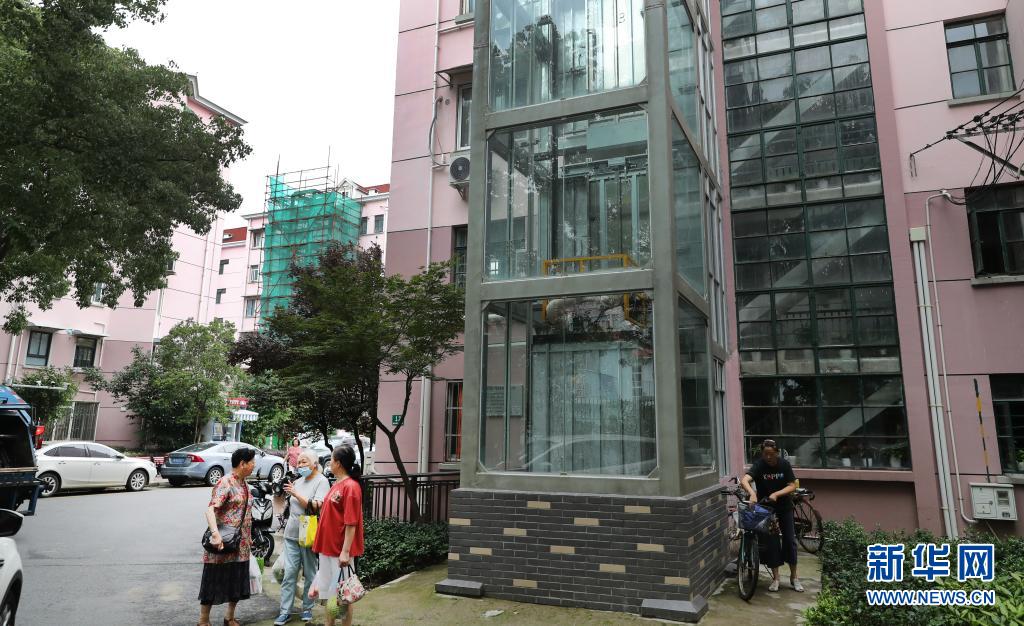 2018年6月28日,社區居民們走出新安裝的電梯。當日,上海黃浦區五里橋街道恭房小區5、6號樓加裝電梯工程順利竣工,居民多年來上下樓困難的問題得以解決。新華社記者 方喆 攝