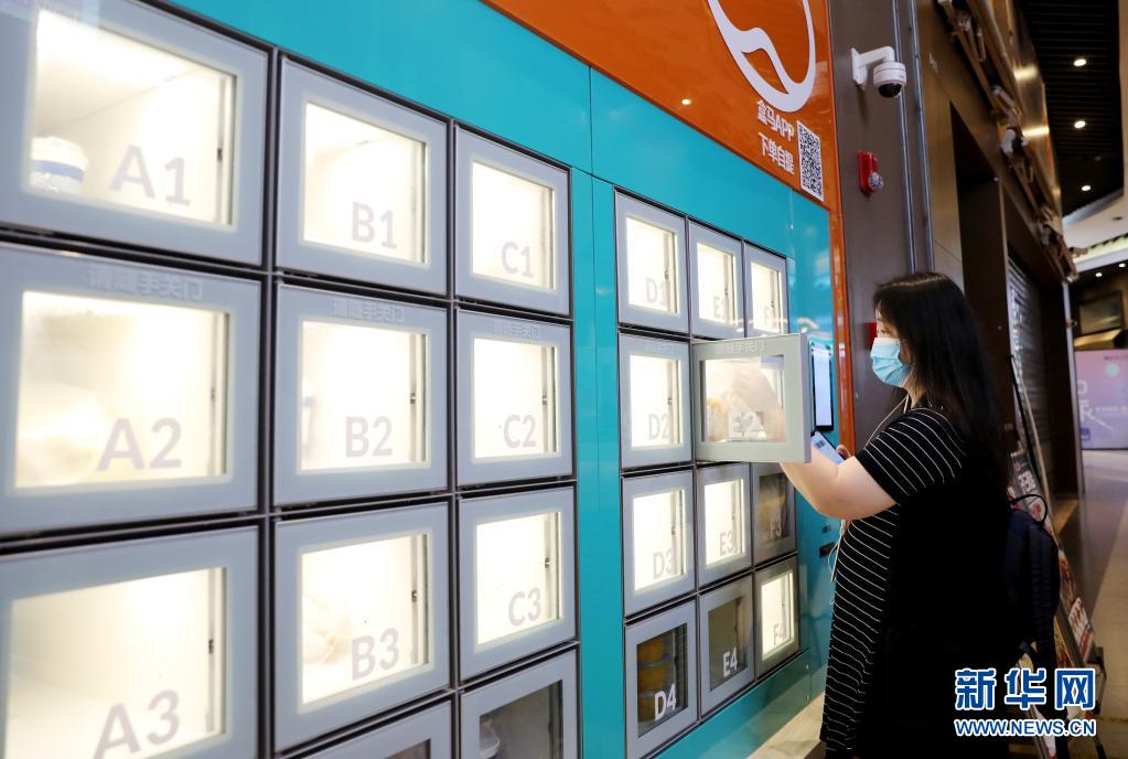 一位顧客通過APP掃碼,在上海地鐵13號線世博會博物館地鐵站附近的一家盒小馬服務點取餐柜中拿取預定的早餐(2020年7月17日攝)。新華社記者 方喆 攝