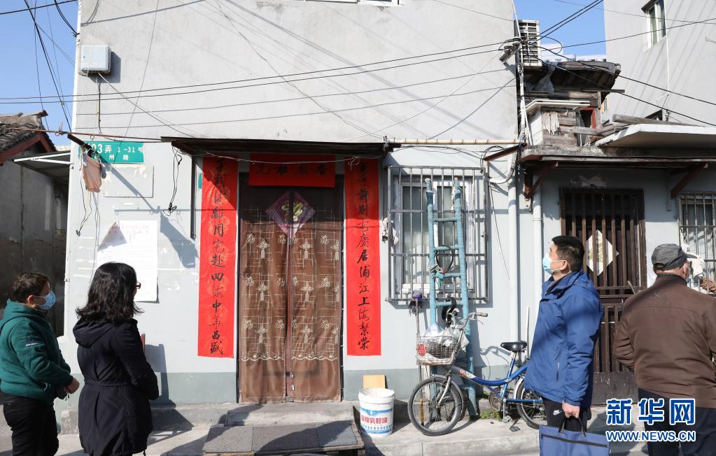 在上海楊浦區一處舊改動遷小區,幾位居民被一戶人家門前貼出的對聯吸引(2020年12月9日攝)。新華社記者 方喆 攝