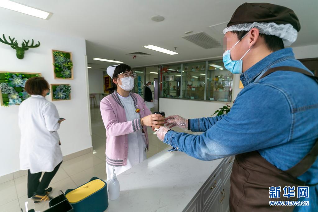 在上海市楊浦區精神衛生中心開了一家名叫“Healing Coffee”的咖啡店,三名已出院的患者輪流擔任調制咖啡、收銀、結算的工作??Х鹊隇樾l生中心的工作人員提供咖啡等飲品。這是見習咖啡師沐枝為醫護人員送上制作好的咖啡(2020年12月3日攝)。新華社記者 王翔 攝