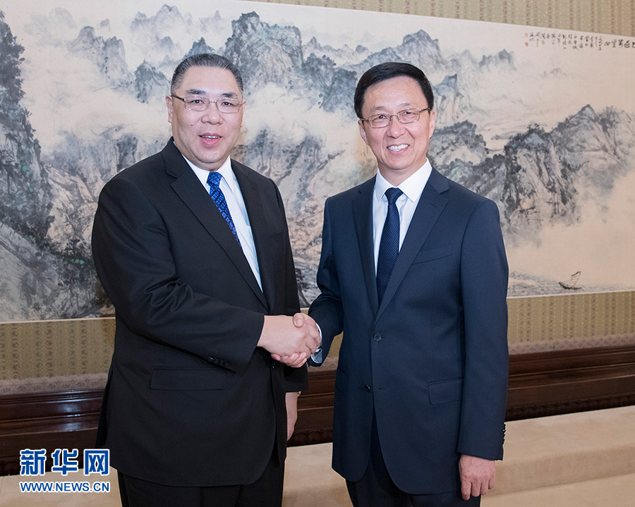 6月28日,中共中央政治局常委、國務院副總理韓正在北京中南海紫光閣會見澳門特別行政區行政長官崔世安。 新華社記者王曄攝