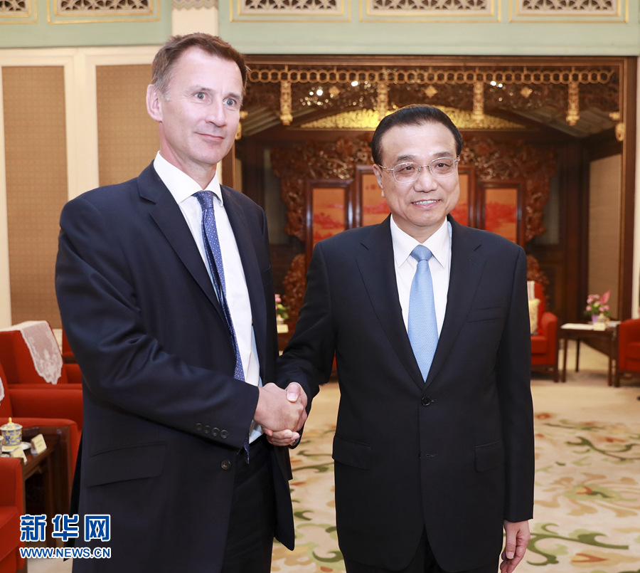 7月30日,國務院總理李克強在北京中南海紫光閣會見來華出席第九次中英戰略對話的英國外交大臣亨特。 新華社記者丁海濤攝