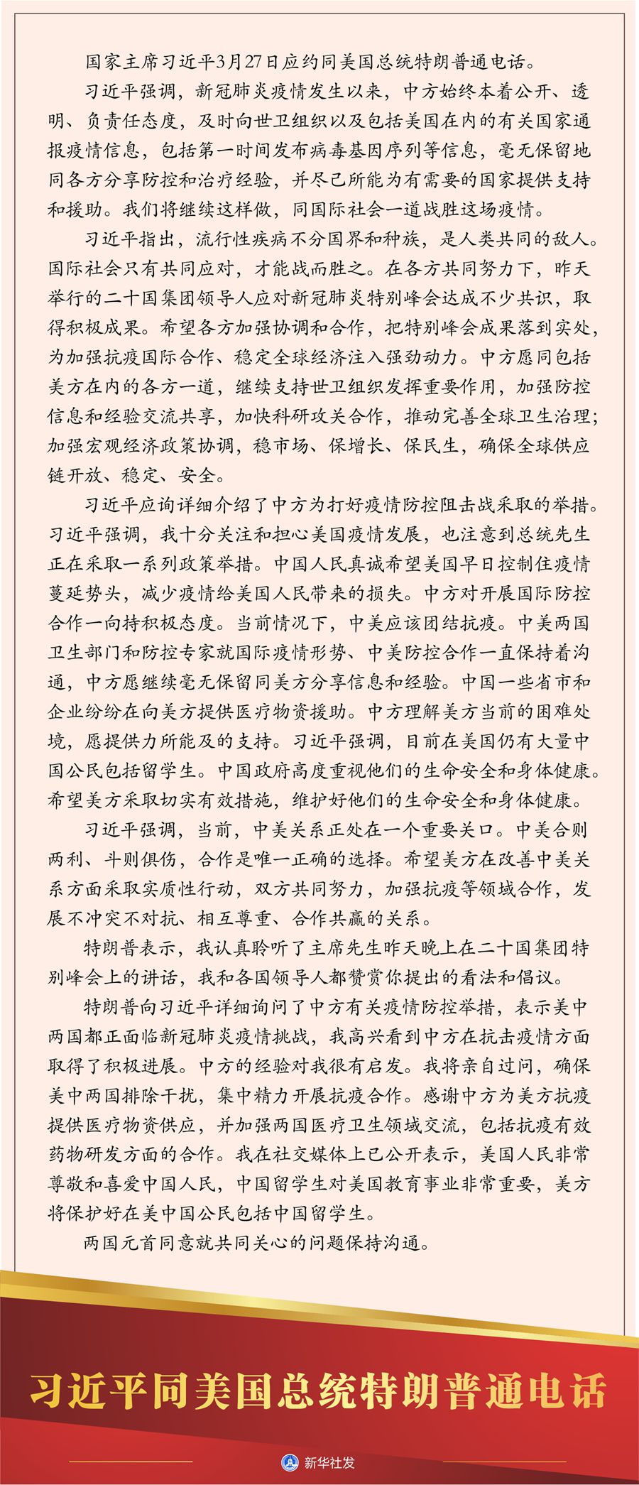 習近平應詢詳細介紹了中方為打好疫情防控阻擊戰采取的舉措。習近平強調,我十分關注和擔心美國疫情發展,也注意到總統先生正在采取一系列政策舉措。中國人民真誠希望美國早日控制住疫情蔓延勢頭,減少疫情給美國人民帶來的損失。中方對開展國際防控合作一向持積極態度。當前情況下,中美應該團結抗疫。中美兩國衛生部門和防控專家就國際疫情形勢、中美防控合作一直保持著溝通,中方愿繼續毫無保留同美方分享信息和經驗。中國一些省市和企業紛紛在向美方提供醫療物資援助。中方理解美方當前的困難處境,愿提供力所能及的支持。習近平強調,目前在美國仍有大量中國公民包括留學生。中國政府高度重視他們的生命安全和身體健康。希望美方采取切實有效措施,維護好他們的生命安全和身體健康。