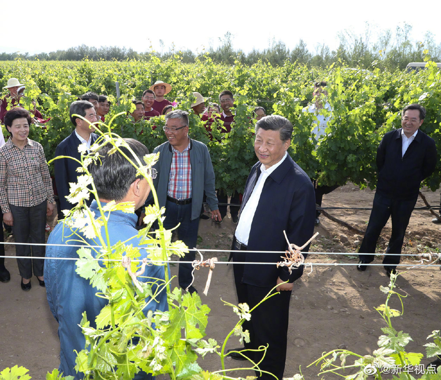 習近平總書記9日在銀川考察調研。他先后來到賀蘭縣稻漁空間鄉村生態觀光園、賀蘭山東麓葡萄種植園,了解當地發展特色農業產業、加強賀蘭山生態保護等情況。(文字記者:張曉松、朱基釵 攝影記者:鞠鵬、謝環馳、王曄、燕雁)