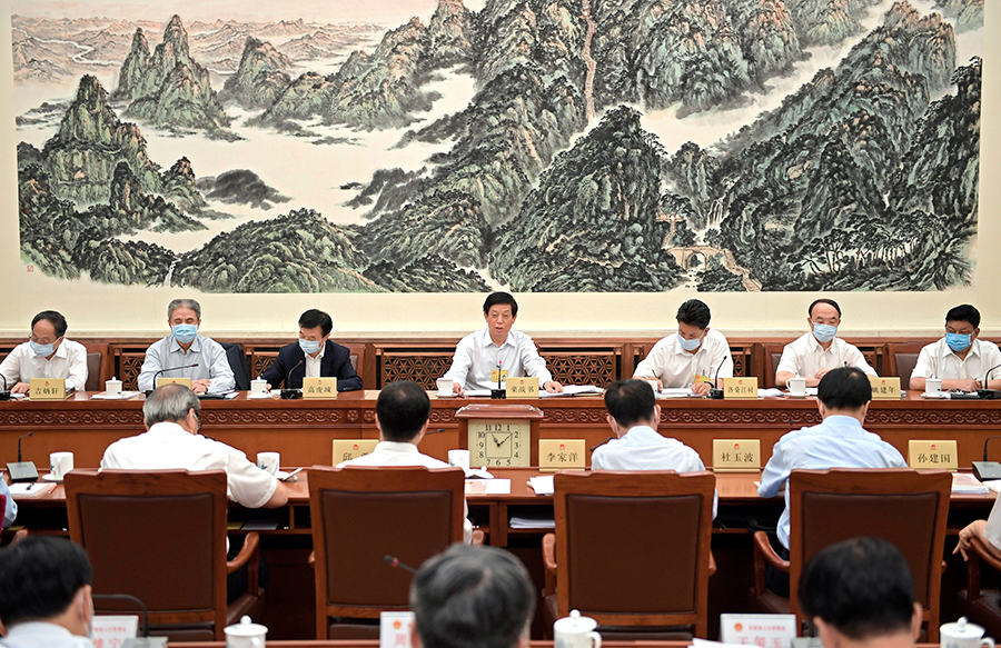 6月28日,十三屆全國人大常委會第二十次會議在北京舉行分組會議,審議香港特別行政區維護國家安全法草案。栗戰書委員長參加審議。 新華社記者 岳月偉 攝