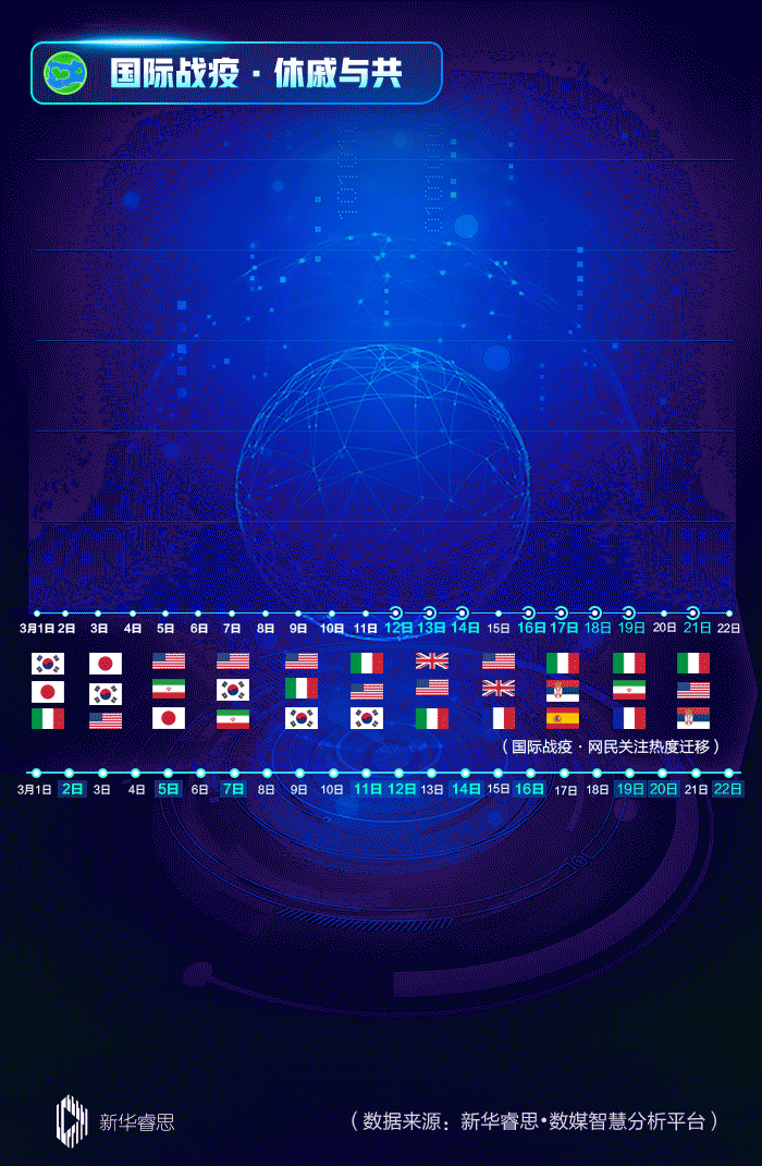 患難見真情。中國以實實在在的行動,支援全球抗疫:派遣專家、交流經驗、共享方案、捐贈物資、聯合研發……一個又一個“硬核”舉措,引發網友高度關注。新華睿思數據顯示,中國派專家組馳援意大利、多國開建“方艙醫院”等新聞事件,在關注度曲線上產生較高波動。與此同時,網友持續關注著韓國、日本、意大利、美國、伊朗、西班牙等國疫情進展。