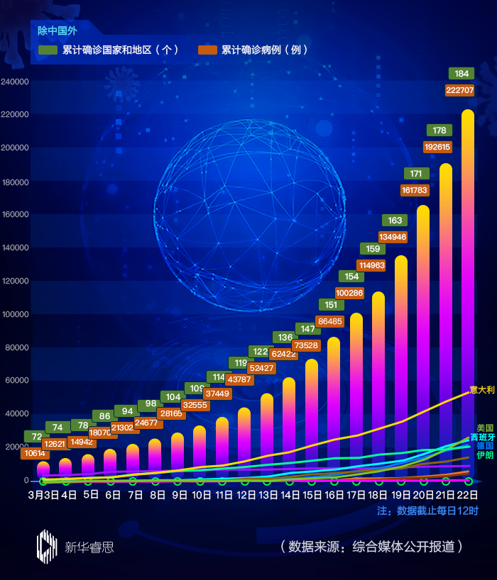 根據世界衛生組織22日公布的最新數據,中國以外新冠肺炎確診病例20多萬。目前,歐洲已成為疫情“震中”,美國宣布進入“國家緊急狀態”,中東多國“封城”,拉美、非洲多國報告確診病例……隨著新冠肺炎全球確診病例持續快速增加,網友對全球疫情進展情況的關注度迅速升溫。