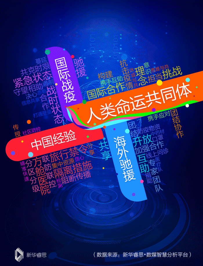 新華睿思持續跟蹤微博、抖音、今日頭條等網上熱搜榜高熱話題,以及重大新聞事件,梳理出網友關注的熱詞集錦。根據關注度排行可以看出,“人類命運共同體”“國際戰疫”“中國經驗”“海外馳援”四個關鍵詞位居前列。同時,“國際合作”“戰時狀態”“方艙醫院”“共享”“開放”“互助”等成為熱搜詞匯。