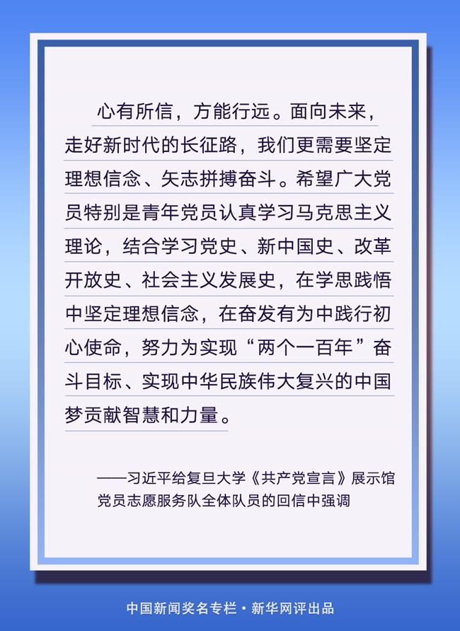 心有所信,方能行遠。今天,歷史的接力棒傳到了我們手中。面向未來,走好新時代的長征路,我們更需要堅定理想信念、矢志拼搏奮斗,不斷創造新精彩,續寫新榮光。 (文字:徐可 海報:張倩)