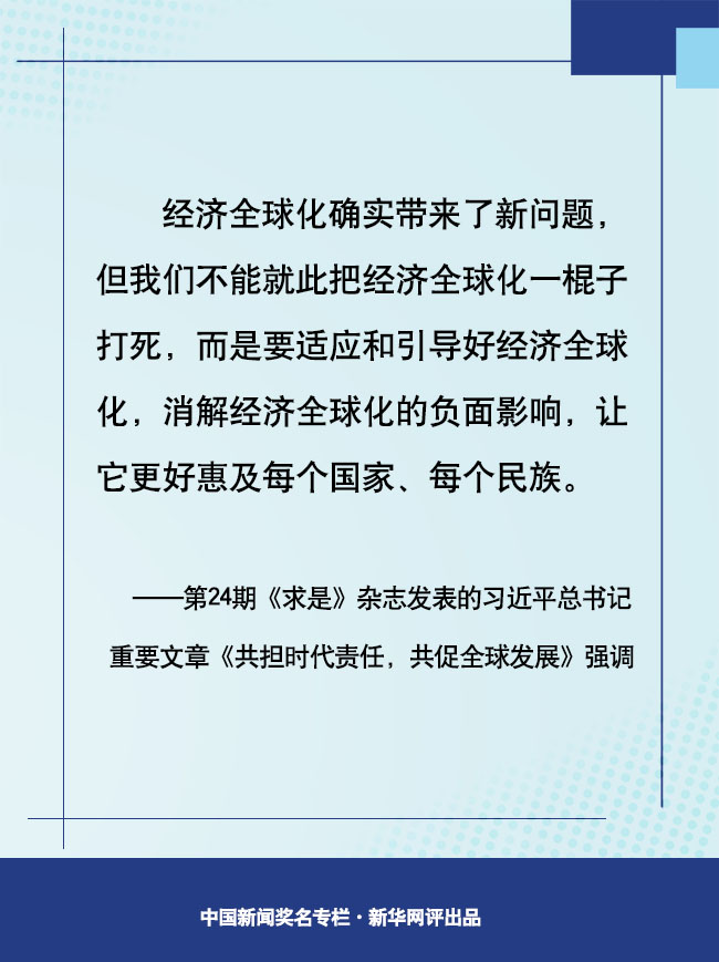 有問題不可怕,可怕的是不敢直面問題,找不到解決問題的思路。面對經濟全球化帶來的機遇和挑戰,世界各國要主動作為、適度管理,讓經濟全球化的正面效應更多釋放出來,實現經濟全球化進程再平衡;要順應大勢、結合國情,正確選擇融入經濟全球化的路徑和節奏;要講求效率、注重公平,讓不同國家、不同階層、不同人群共享經濟全球化的好處。只有把握規律、認清大勢,共同把經濟全球化動力搞大、阻力搞小,才能順應各國人民對美好生活的向往,讓經濟全球化更好惠及每個國家、每個民族。