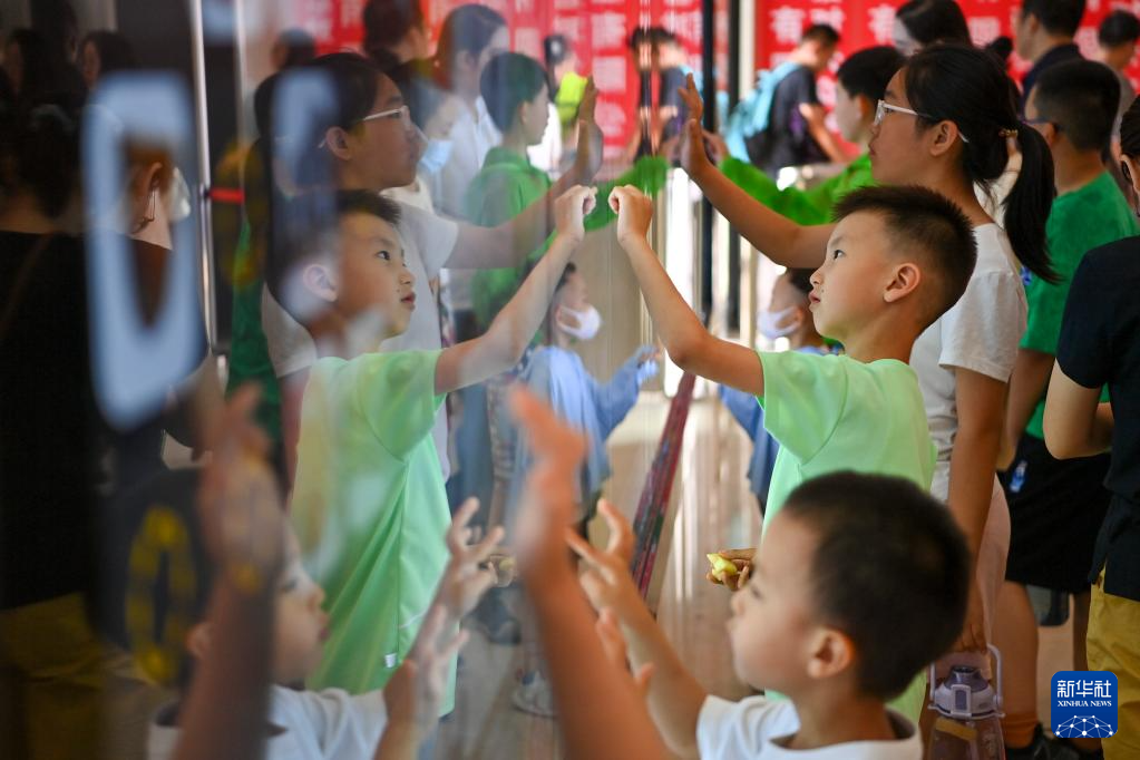 7月1日,在山西地質博物館,小朋友們通過電子屏幕參與互動小游戲。