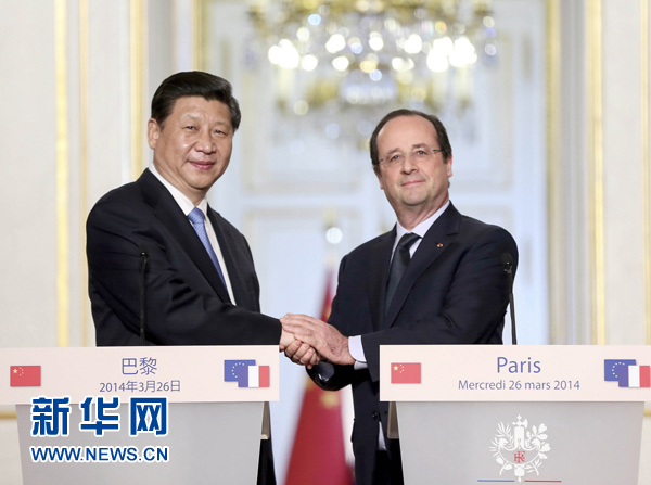 ??? 3月26日,國家主席習近平在巴黎與法國總統奧朗德共同會見記者。 新華社記者 蘭紅光 攝