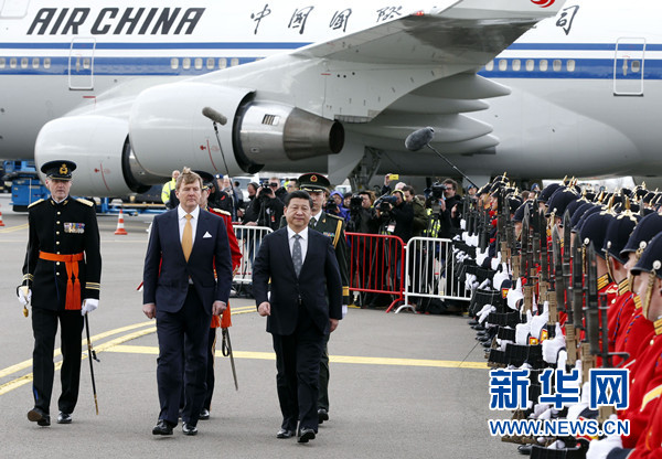 ????3月22日,國家主席習近平抵達阿姆斯特丹,應荷蘭國王威廉-亞歷山大邀請,對荷蘭進行國事訪問,開啟歐洲之旅。威廉-亞歷山大在機場為習近平舉行隆重歡迎儀式。這是習近平在威廉-亞歷山大陪同下檢閱儀仗隊。新華社記者 鞠鵬 攝