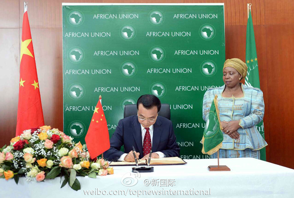 ????新華網北京5月6日電 據新華社“新國際”微博報道,5日上午,李克強在非盟委員會副主席姆溫查陪同下參觀了非盟會議中心。參觀結束后,應非盟委員會主席祖馬邀請,李克強在貴賓簿上題詞。
