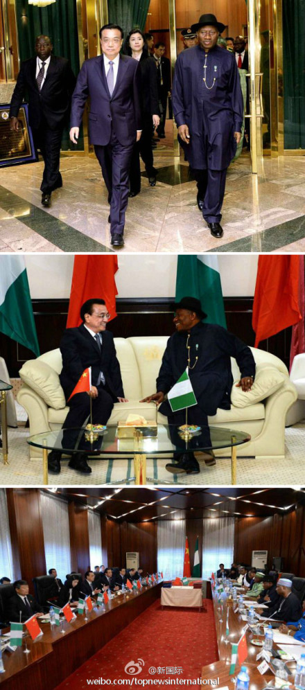 ??? 新華網北京5月7日電? 據新華社“新國際”微博報道,7日,國務院總理李克強在與尼日利亞總統喬納森舉行會談時表示,中國企業自主研發的高標準支線飛機不僅擁有安全質量保證,而且性價比高,非常適合非洲市場,希望能成為尼及非洲航空公司的首選。?