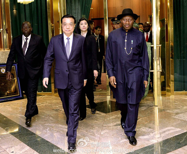 新華網北京5月8日電 據新華社“新國際”微博報道,李克強7日與尼日利亞總統喬納森會談。喬納森感謝李克強在尼安全形勢嚴峻的情況下如期到訪,是患難見真情。李克強表示中方將對尼提供各種支持和幫助,同時希望尼方切實加強對在尼中國公民的保護。目前中國在尼有6.5萬人,是我在非人員最多的國家之一。