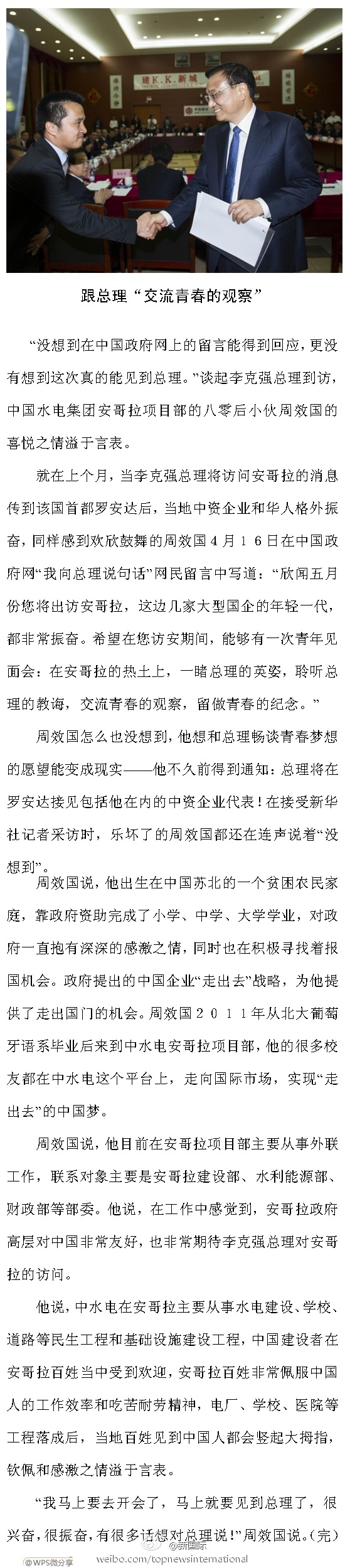 ??? 新華網北京5月9日電 據新華社“新國際”微博報道,80后的周效國2011年大學畢業后,被派往中水電安哥拉項目部工作。不久前獲知李總理將訪安,他在中國政府網給總理留言,希望與總理“交流青春的觀察”。8日,李克強在安主持召開海外民生座談會,周效國夢想成真,受邀參加并作了發言。詳情請戳長微。