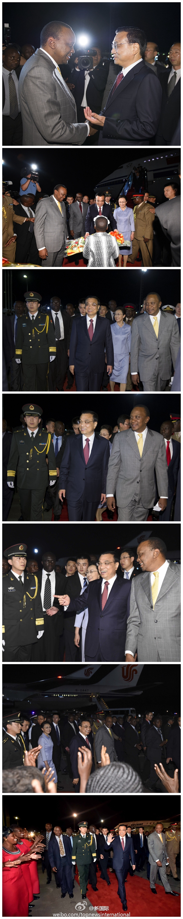 ????新華網北京5月10日電? 據新華社“新國際”微博報道,李克強總理9日晚乘專機抵達內羅畢,肯尼亞總統肯雅塔和副總統魯托率肯政府高級官員到機場迎接,當地民眾以盛大的特色民族歌舞,歡迎中國貴賓到來。