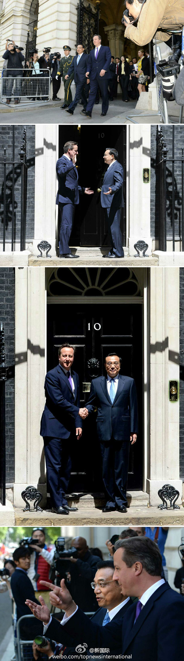新華網北京6月17日電 據新華社“新國際”微博報道,17日,英國首相府所在的唐寧街附近五星紅旗飄揚,卡梅倫為到訪的李克強總理舉行隆重歡迎儀式。隨后,兩位領導人步行來到首相官邸。面對中外記者的鏡頭,李克強與卡梅倫握手合影,愉快交談。在首相府一層內閣會議室內,兩位領導人就雙邊關系和共同關心的問題舉行會談。
