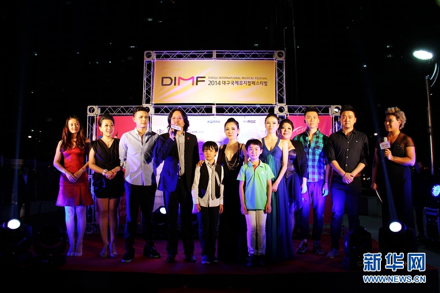 ??? 《媽媽再愛我一次》制作人李盾(左四)與主演們亮相大邱國際音樂劇節。新華網記者 彭茜 攝??