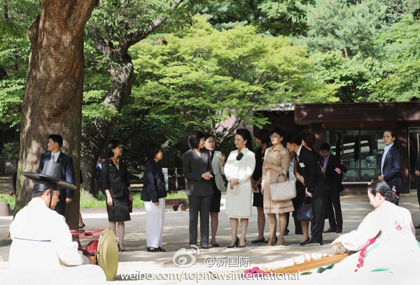 ???? 新華網北京7月3日電? 據新華社“新國際”微博報道,習近平主席夫人彭麗媛3日下午在韓國官員陪同下參觀被列為世界文化遺產的昌德宮,了解宮殿建筑歷史、音樂傳承等情況,并欣賞韓國傳統樂器伽倻琴散調表演,對藝術家的精彩演出表示高度贊賞。彭麗媛說,中韓友誼源遠流長,歡迎韓國朋友多到中國參觀訪問。
