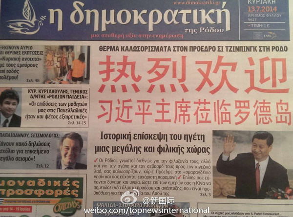 ????新華網北京7月14日電 據新華社“新國際”微博報道,希臘羅德島報紙《民主報》13日在頭版發表題為《一個偉大友好國家領導人的歷史性訪問》文章,并用中文紅色大字體寫著“熱烈歡迎習近平主席蒞臨羅德島”。文章說,熱情好客的羅德島人民祝愿習近平主席身體健康,祝愿中國在習主席領導下取得跨越式發展,祝愿中國繁榮昌盛。