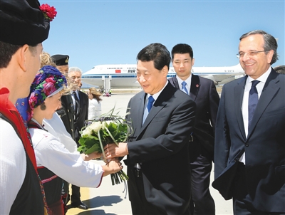 習近平抵達羅德島迪亞哥拉斯機場時,希臘總理薩馬拉斯專程從首都雅典前來,并率多名內閣部長和羅德市市長到機場歡迎。習近平在舷梯旁同薩馬拉斯握手,互致問候。身著當地傳統服裝的希臘青年向習近平獻花。希臘禮兵沿紅地毯兩側列隊,向習近平行注目禮。