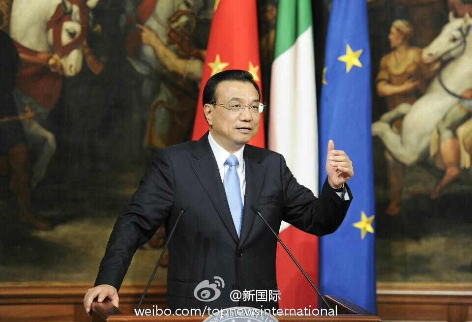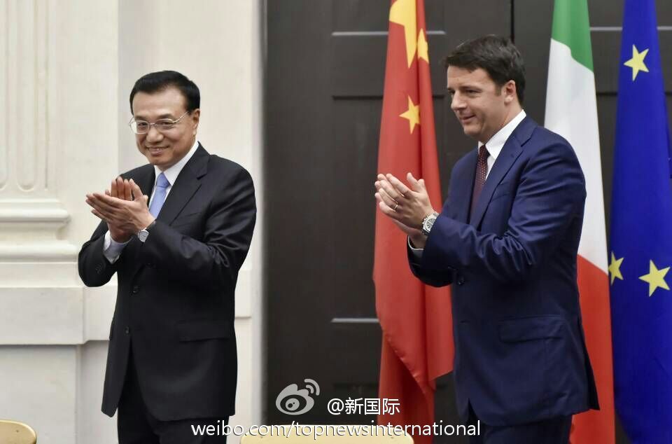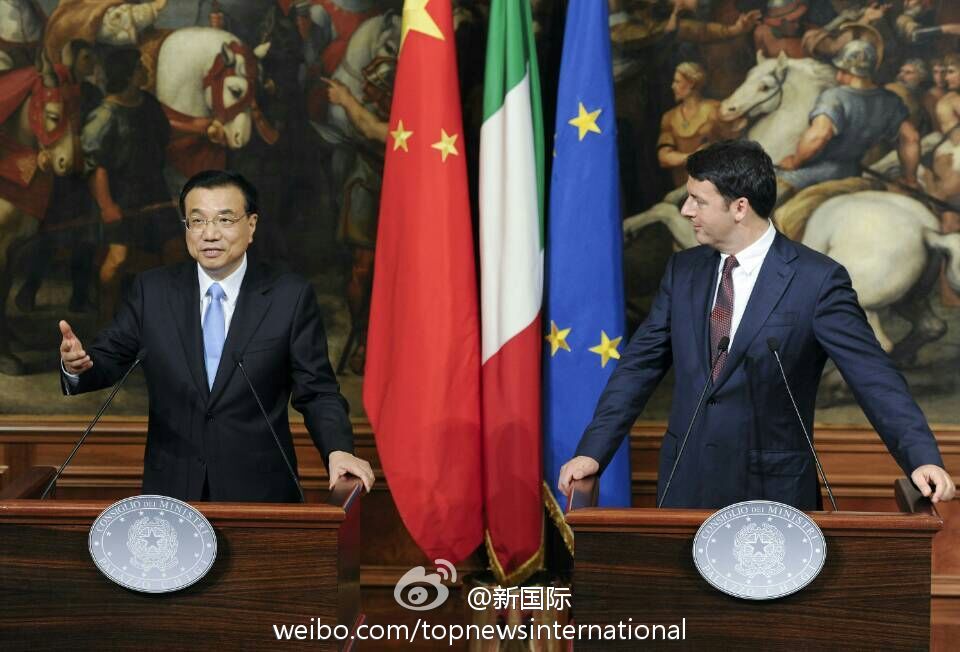 ??? 新華網北京10月15日電 據新華社“新國際”微博報道,國務院總理李克強14日與意大利總理倫齊在意總理府共同會見記者。李克強說,很高興來到不是一天建成的羅馬,中方不追求對意貿易順差,對擴大中意貿易合作規模充滿信心,愿與意方繼續深挖務實合作。即將簽署的協議規模高達80億歐元,這說明貿易投資規模還會擴大。?