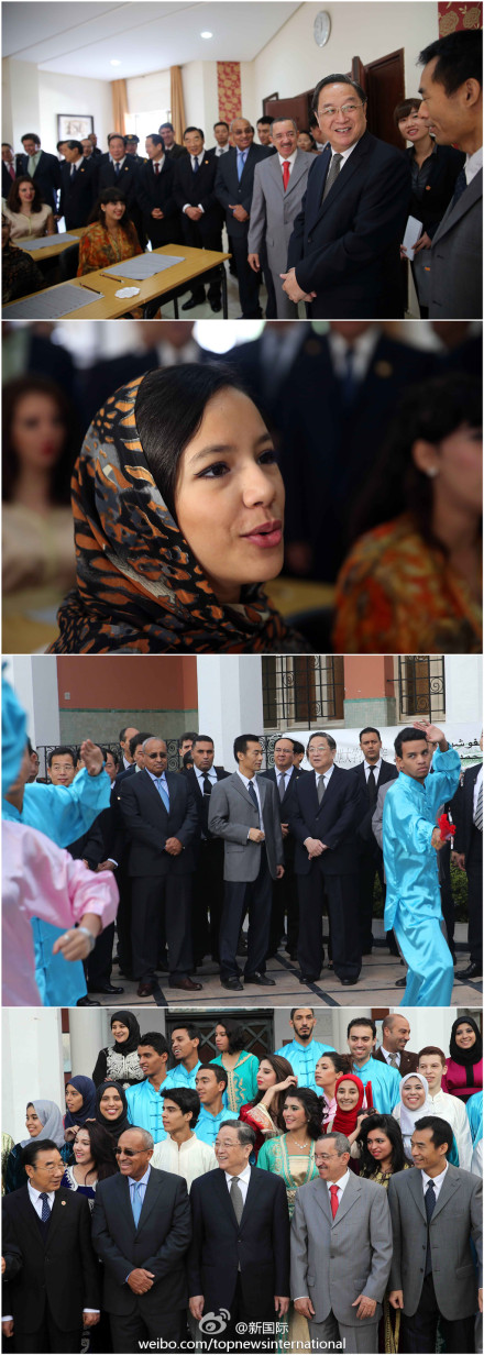??? 新華網北京11月6日電 據新華社“新國際”微博報道,全國政協主席俞正聲5日參觀摩洛哥穆罕默德五世大學孔子學院,身著摩中兩國民族服裝的當地學生誦唐詩、打太極、跳《小蘋果》歡迎。俞正聲走進課堂對學生說:“你們是中摩友好的未來。希望大家用心學好中文,促進合作交流?!?(記者李拯宇 攝影劉衛兵)