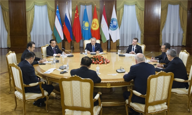 ????(納扎爾巴耶夫總統集體會見上合組織成員國總理、秘書長和地區反恐機構執委會主任,攝影記者:黃敬文)
