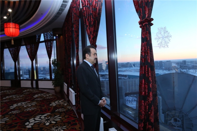 ????早餐后,兩位總理意猶未盡,又繞著圓形的餐廳極目遠眺。窗外,明媚的太陽正緩緩升起,給銀裝素裹的阿斯塔納鑲上一層淡淡的金色??藦娍偫韺ⅠR西莫夫總理送至酒店大堂,微笑著握手話別,繼續一天緊張的日程。